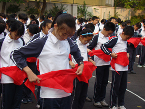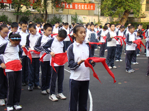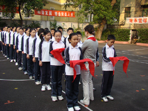飘扬的五星红旗下,七年级全体师生庄严肃立。学生们白色衣襟前的红领巾无比鲜艳;老师们颈上的领巾勾起了他们对过往的回忆。曾经……现在……只听主持人沉缓而明朗的声音:“红领巾是国旗的一角。是用先辈们的鲜血染成的……”同学们认真地听着,不禁心潮澎湃——英雄们热血奋战,抗日为国;改革开放艰难的道路;如今美好的幸福生活。无形中,大家感到身上的责任更重了。
