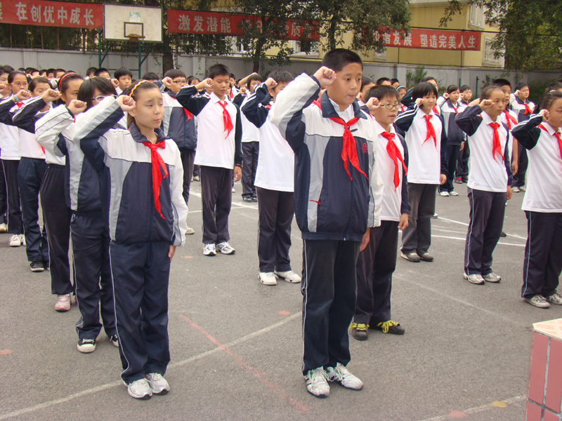 七年级一百九十余名学生肃立在操场上,唱响了《中国少年先锋队队歌》,振奋人心的歌声过后,同学们在大队长的带领下,一起解下相伴多年的小号红领巾,并把红领巾连同童年的记忆一起珍藏起来。然后同学们从辅导员老师手中接过标志成长,代表责任的大号红领巾,庄重地系在胸前。少先队员代表带领大家宣誓:“人大领巾大,人大责任大,珍爱少先队,弘扬民族魂,以我所能为祖国、为家乡、为学校尽责任!做成功的南模初中人!” 崭新的大号红领巾飘扬在同学们胸前,一份责任悄悄在同学们的心中萌生。
