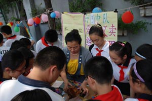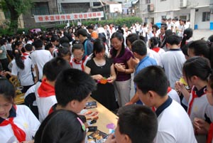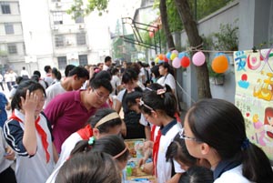 义卖会上的海报主题鲜明而有号召力。“童心 同乐”、“世界因爱而精彩”、“用我的真心,换来你的爱”、“爱心义卖,情义无价”……从海报的宣传语中我们能够看到同学们的爱心和责任心。义卖的物品琳琅满目,看过的书籍,自己的玩具,文化用品等等。在义卖会上同学们的DIY作品尤其走俏。如同学自己绘制的水粉画、手工制作的十字绣公交卡袋等作品,简约中透着智慧,让人爱不释手。
