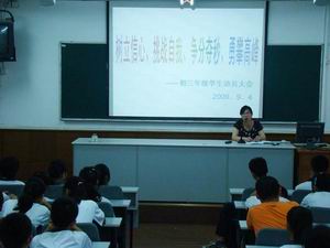 分管教学工作的吕薇华副校长以09届毕业生创造的优异成绩作为新开始的奠基,以超越为目标,以进步为挑战,鼓励所有初三学生不仅为学校也为自我努力奋斗初三,再创佳绩!同时吕校长也给所有初三学生提出了四点要求和建议:一、为自己设立目标。初三直击着中考,为自己选定一个能够通过努力达成目标的高中,是至关重要的一点。每个学生都要正确认识自己,定位准确后,再开始设定每天每周每月的小目标,竭尽全力超越自我,让自己看到胜利的曙光;二、具有紧迫感。离最后的中考时间只剩下八个月左右,时间迫在眉睫,对于只有一次机会的中考,每个人更应该抓紧每分每秒,具有一定紧迫感才能有所警觉,提高学习效率;三、养成良好的习惯。正确的学习方法,良好健康的习惯才能使学习事倍功半;四、调整好心态。每位学生都应该调整好自己的心态,不因短暂的成功骄傲,不为一时的挫折气馁,相信自己才能有勇气战斗下去!